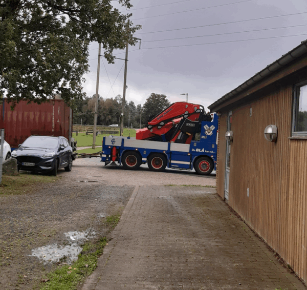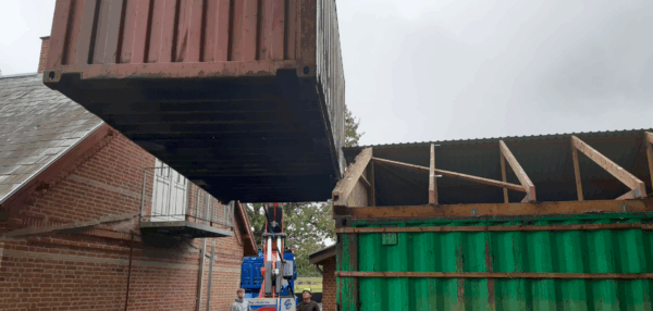 Mandag den 15.9 stod Hadbjerg tømrerfirma for alt det “ydre” arbejde med containeren: Indkraning, fundering, placering, tilpasning af tag, beklædning mv.